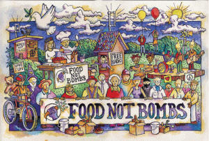 The name “Food Not Bombs” reflects the organization’s emphasis on redirecting resources from military spending and other destructive activities towards meeting basic human needs, particularly the need for food (i.e. there is always government money to fund the military, but not enough to make sure that all citizens to have enough to eat). Volunteers in various communities come together to collect surplus or discarded but safe to eat food from local grocery stores, bakeries, and farms. They then prepare and distribute vegetarian or vegan meals to the community, usually in public spaces.